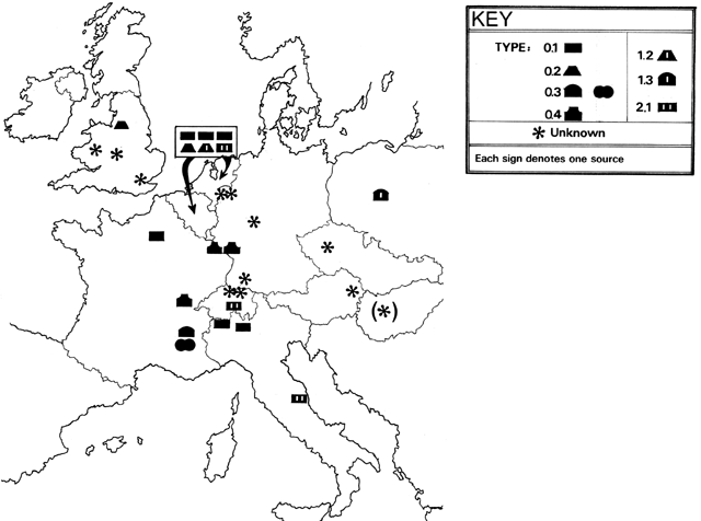 fig. 36: Distribution of dulcimer sources - the first 50 years, 1440-1490