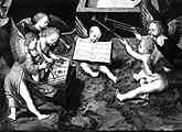 The wrest- and hitchpins are also interesting: they are shown in the top of the soundboard, a position unusual in representations, but normal in surviving instruments. The ensemble of shawms and trumpets strongly suggests improvised music for a basse dance (177), although this contra-indicated by the presence of written music: this is a four-part Gloria in choir-book format and is complete with underlain text, although no-one is singing from it. Prof. Ian Bent has identified the script as dating from c.1440, some 70 years earlier than the painting itself. It is noticeable that only the wind players are shown as looking at the written notes. while the dulcimer-player is concentrating, presumably, on hitting the right string.
