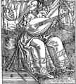 These references are missing from the 5th edition of 1545 but Agricola still gives the illustration as before (the spelling of the caption without the final 'h' this time, 'Hackebreth' has become 'Hackebret') and there is an additional dulcimer in the frontispiece by the feet of Fraw Musica (fig. 55b), another woodcut which was reused elsewhere.