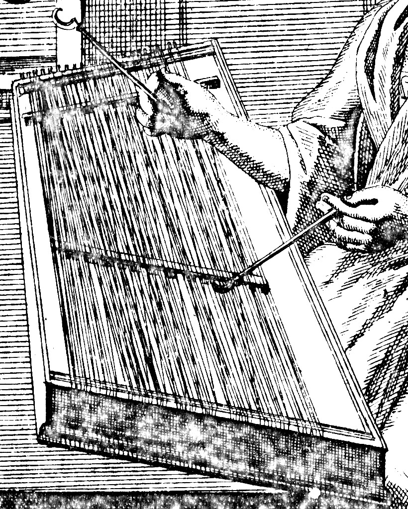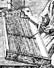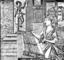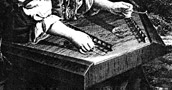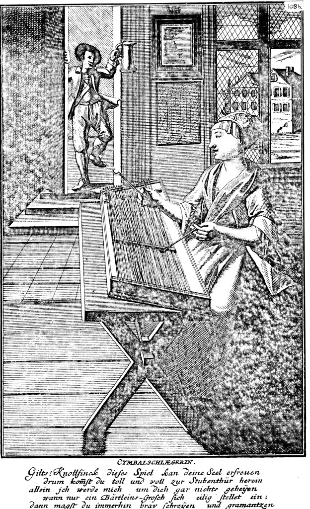 Closer to real life is perhaps the Cymbal which Johann Christoph Weigel included in his Musicalisches Theatrum (fig. 59), produced in Nuremburg sometime between 1715 and 1725; the caption was discussed in the previous section. The treble bridge seems to have been drawn a bit skewed, dividing the strings at about 2:3 at the top but then almost parallel with the left edge rather than equally between the two edges; bass bridge in the normal place, close to the right-hand edge. Perhaps 20 or 21 courses, two tuning pins shown for each, but the model might have have more. Apparently box construction with wrest- and tuning-blocks inside, hitch-pins in the side rather than on the top, wrest-pins presumably intended to be the same on the other side, though playing with the perspective makes them visible anyway; no decoration shown. Hammers are held between the first two fingers, in the left hand steadied by the thumb, in the right hand not. The Hackbrett placed on a small but sturdy table, which doesn't have anything else on it, nor room for anything else, the player seated, playing alone, no-one else doing anything in the room except the visitor at the door. Apparently a rather large instrument. Or a rather small player, of course.
