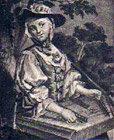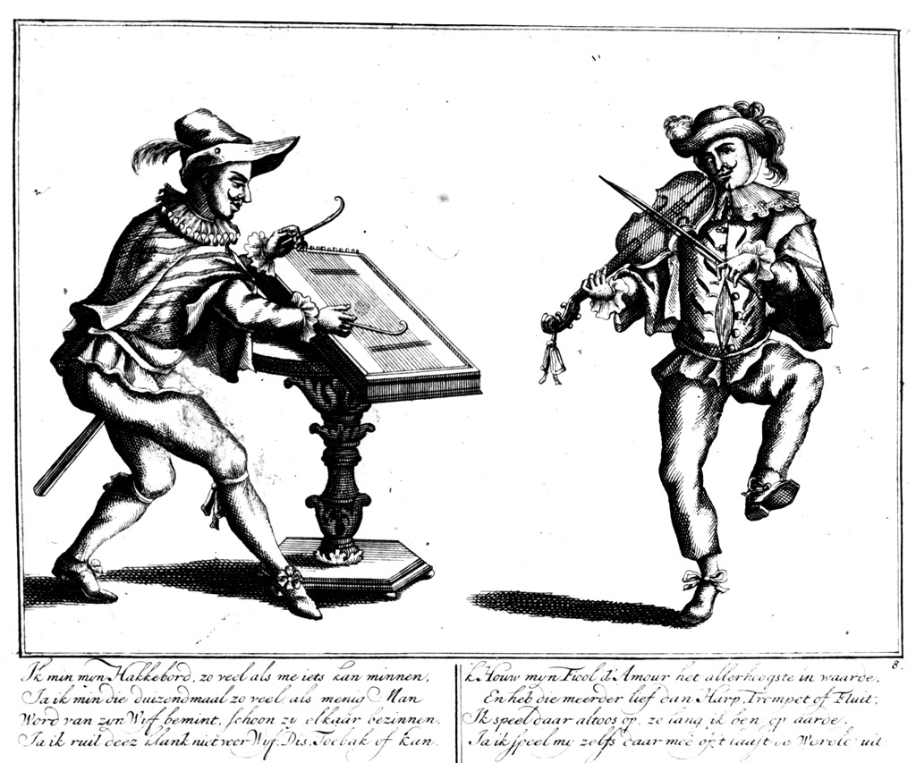 The bridging on the Flemish engraving at fig. 68 is also something of a puzzle: taken as a true representation of its model, the latter would be of type 0.1., of which there were five convincing examples in the 15th century. However, the only two 16th century representations are very sketchy, and there are no others in the 17th or 18th centuries, so it seems safest to conclude that the artist did not feel bound to reproduce all the details. The wrest-pins are rather unusually shown on the left, but when we notice that the accompanying fiddler is left-handed we conclude that this plate was also reversed: a costume expert might be able to confirm this point.
