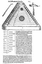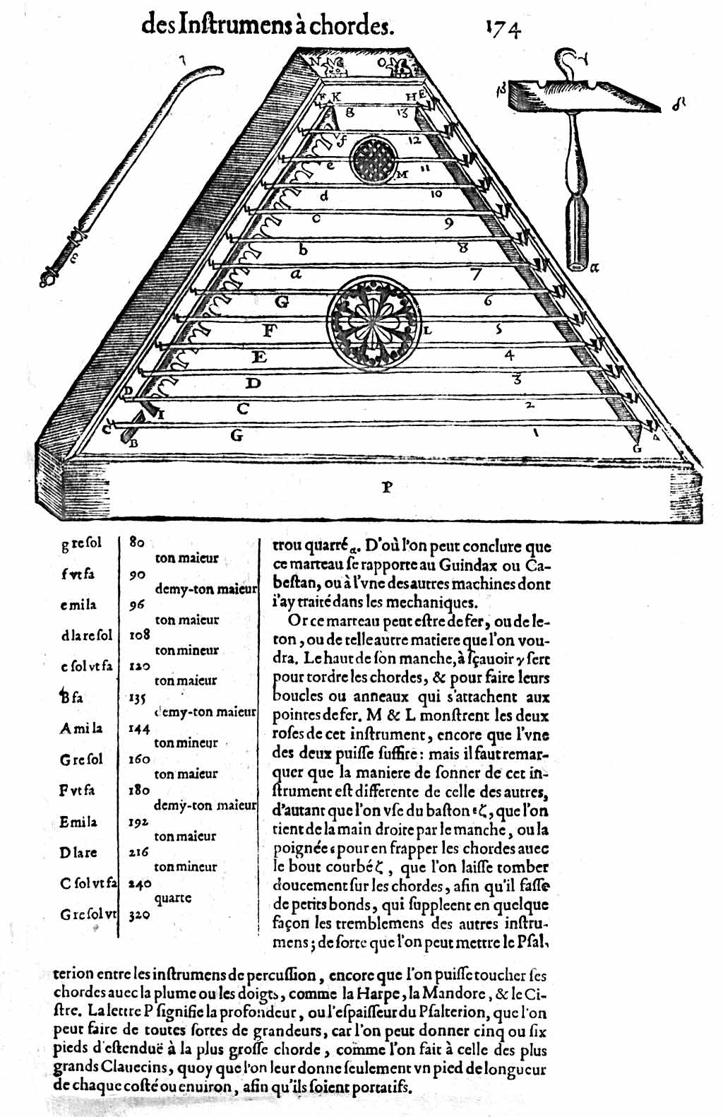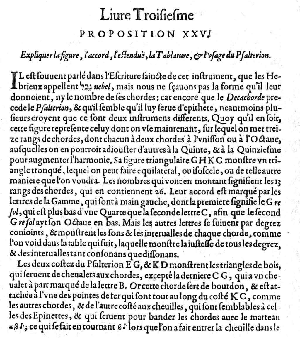 Very much more informative is the account of the psalterion in the Harmonie Universelle (1636 etc) of Father Marin Mersenne - scientist, mathematician and physicist; indeed so comprehensive is his treatment that having quoted him in full there sometimes seems very little left to be said about the instrument. His work is chiefly concerned with construction, and includes detailed tables of string gauges, both wire and gut, discussion of the precise thickness of a good soundboard and so on; yet he devotes some 1,000 words to the psalterion, quite the most of anyone until recent times, covering bridging, stringing, tuning, temperament, playing techniques and repertoire, including a little of what he saw as its history. He even mentions a current controversy - apparently still not settled today about the nebel of the Scriptures. He writes very enthusiastically about its many advantages, in a manner surprisingly reminiscent of late-Victorian advertising slogans, after saying that the instrument is ideal for those with little time to spend, yet capable of much pleasure when diligently perfected; he concludes with a little aside, apparently aimed at his detractors. The summary headings are mine, added for ease of reference since the various aspects are not structured, but are, rather, "cheek by jowl".