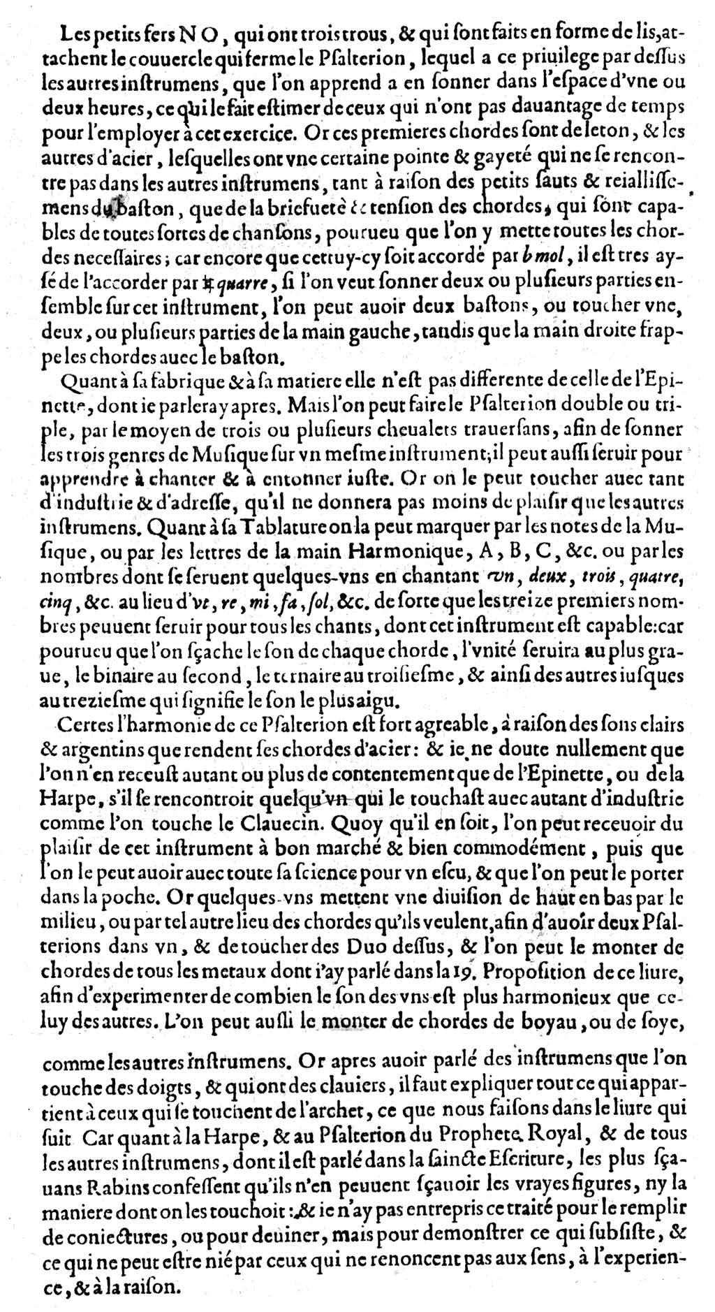Almost every paragraph warrants comment, but we will limit ourselves chiefly to those points which Mersnne was the first to mention. The first remarkable point is about tuning each course in fifths or fifteenths: it is not clear that such tunings were actually used, since Mersenne says "on en pourroit adiouter d'autres", 'others could be added', implying a prescription rather than a description; the author has tuned a dulcimer thus and the effect is certainly very striking, much as a mixture stop on an organ, but rather more powerful - an analogy with a hurdy-gurdy tuned in fifths might be more appropriate - and certainly the thought of trying to blend in ensemble with such sounds is daunting.
