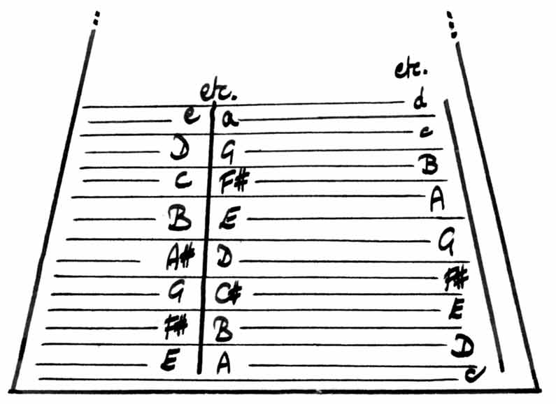 A third problem is that, assuming the central line to represent a bridge, each string is divided into two portions, giving only two series of notes, not three. We should presumably take the diagram to be a simplification of the most common system, of strings alternately divided and undivided, only half the total number of courses having been shown; and presumably the first series is that which is usually played immediately to the left of the bridge, not at the far left as shown. There could be other interpretations, of course, but since an interpretation following common practice produces a feasible result there seems little point in looking further at present: if this is a correct interpretation, the first series can be seen to be a fifth above the second series (or a fourth below it, of course): a few of the intervals are augmented or diminished, but the chessmen bridges normal on Italian salterii provide for such flexibility even though they are not shown. If we consider the second and third series to be provided by separate sets of strings, we find a fifth between adjacent courses, and the diagram may be represented thus: