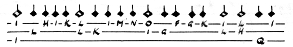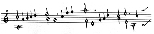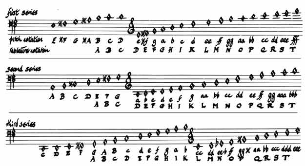 The tablature itself, consisting only of a single line, contrasts with the many pages of ensemble music for the more 'mainstream' instruments; yet it is particularly interesting, for it is the only example found of a tablature specifically designed for dulcimer (165): and indeed it seems likely that it was devised specially for this one work. The three series of notes already discussed are represented by three lines, and the courses of each series to be played are shown by letters on the appropriate lines. The minims and crotchets show when each note is to be plucked: