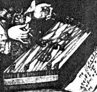 The way of holding the hammers between the first two fingers corresponds with older illustrations, and with contemporary illustrations of the players of popular instruments, as does the apparent solo nature of the performance, and the placing of the instrument on a table.