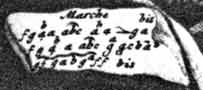 The tablature, however, is much more unusual: the problem of hitting a specific string whilst keeping one eye on a page of notes has defeated most players of whatever place and time. The way the sheet of paper curls at the edges is shown slightly differently in the two engravings, and it seems that Trouvain's version has one or perhaps two notes more, at the end of the first line, than does Schenk's - another point in favour of Trouvain's being the original - but on the whole his is a little less clear, at least in my reproduction. Several details obscure the realisation of the tune, notably the 'hair pin' towards the end of the first line: the placing of two musically adjacent notes one above the other (were the notes not discordant, they might have been intended as chords, but perhaps they indicate grace notes, recalling the ligatures of mediaeval notation); and the stroke under the 'a' appearing as the third letter in both the first and second lines. The use of the curved line to suggest the tails of a group of quavers is common enough, however.