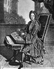 Perhaps the surest indication is the positioning of the bass bridges: although these are shown on both sides on the instrument, one row has six bridges, evenly-spaced, while the other has only four, spread about with two single ones near the player, and a pair together at the top. It is likely, then, that the former row is the right-hand bass register, and since the picture which shows this row on the right is that of Trouvain, his may perhaps be the original version: whether Peter Schenk is likely to have omitted the panoramic background in making a copy is another question.