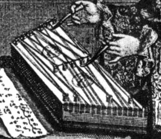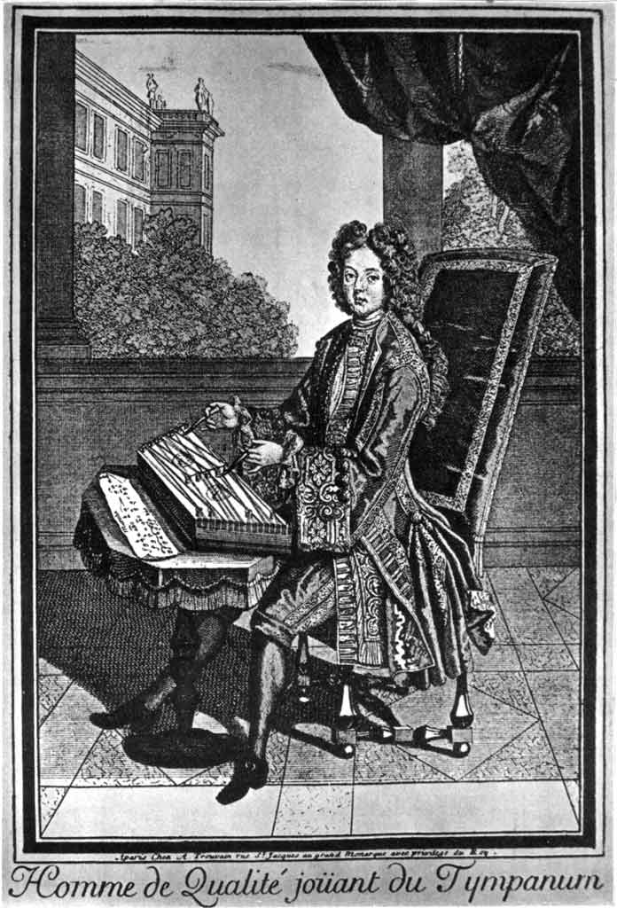 An engraving by Danckerts reproduced in Kinsky (p.239) shows a lady, her tympanon laid on a table, playing in concert with lute and flute; bridging of type 11 is suggested, but no details are really discernable.