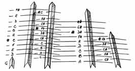 The note F♭ occurs twice, in each case in a position where there is already both an E♮ and an F♮ but no F# ; since the flat sign is otherwise not used in the diagram (D# and A# are used, for instance), it seems impossible that an F♭ tuned distinctly from E♮ can have been intended, nor does the normal usage, of F♭ = modern F♮ seem appropriate, since there are already Fs. Unlikely as it may seem, perhaps we must take them as meaning F#. The diagram itself does not show in which octave the various pitches lie, but these an be deduced; using the 'corrections' just discussed, the scheme has been reconstriced in Helmholtz' notation at fig. 81 and the overall range is also given in staff notation.