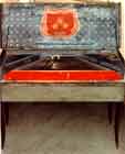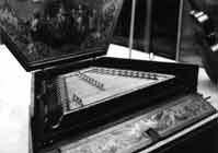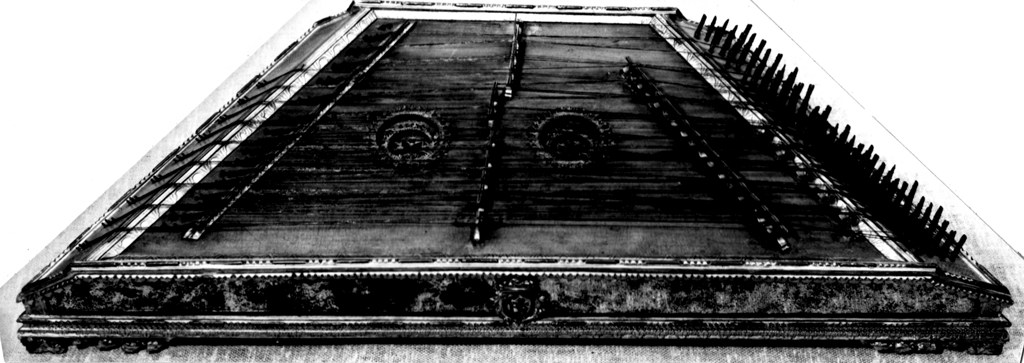 The instrument in fig. 87 has roses of pierced leather, and the gilded and beautifully-carved wooden rose in fig. 91 is untypical. Eight instruments have moulded feet, one at each corner, while nine have a case in which to sit - either their own, or quite often from another time or place completely: one such case, Stockholm F 256, is padded, perhaps with travelling in mind, while at the other extreme another, Stockholm, Roca 1734, has legs, anticipating the Durand dulcimer of the 1860s.