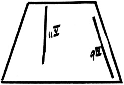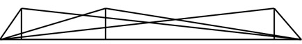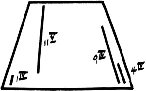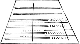 Imagine an instrument with three bridges, each having three courses, of three, two and one string respectively; the bridging would appear as shown in fig. 93,