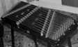 The instrument shown in fig.163 is finely built; beaded to conceal the joints and finished off with black-stained button polish. The oblong shape was only incidental: he had a piano wrest-block, complete, and rather than take all the pins out and have all the trouble of putting them in a new block, he thought he would leave them as they were; however, the angle of each row of pins was perpendicular to the edge of the block, so the external shape had to be oblong. The saddles nevertheless form the usual trapezoid, of course, and to keep the tension on the portion of the strings between the saddles and the pins, he has fixed a heavy metal batten immediately behind each saddle, under which the strings pass.