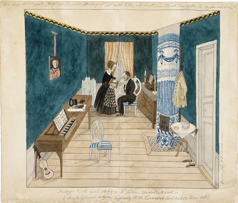 Utom det lilla porträttet har mamsell Sjöberg också målat en situationsbild från Ferdinand Tollins besök hos henne den 12 april 1844. Denna dag är han klädd i frack med anledning av konungens frånfälle. På klaveret har han lagt sin cylinderhatt, de svarta handskarna och cigarren, vid dörren har han lämnat käppen och galoscherna. De sistnämnda är så små att de verkar felproportionerade, men vi vet genom August Blanche att Tollin hade ovanligt små fötter, så nog passar galoscherna. På en krok vid kakelugnen har han hängt sin korta, sandgula ytterrock, och att även den är autentisk har vi belägg för från ett annat håll, nämligen från Tollins egen teckning av en mellanakt i gamla Operakällaren 1843, där han själv står vid skänkdisken, iklädd samma ljusa ytterrock. Sådana detaljer framhäver den dokumentariska pålitligheten i mamsell Sjöbergs akvareller.