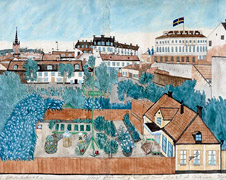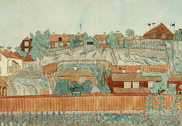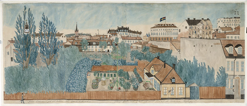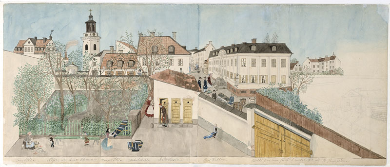 En av dem har redan berörts i inledningskapitlet - det är din dir hon sitter och målar i Bergqvists handelsträdgård vid Tjärhovsgatan. Ytterligare tre reproduceras här: en från hennes åttonde bostad, Katarina Högbergsgata 25, en från hennes tionde, S:t Paulsgatan 20, och en från hennes tolfte, Blecktornsgränd 6. Utsikten från Katarina Högbergsgata är sedd norrut, mot Mosebacke, och är målad på 1860-talet. Nere på gatan kommer en ensam herre vandrande - hög hatt, cigarr, paraply, det är hennes käre gitarrelev John Edholm på väg till en lektion - längs planket till en av de enfamiljsbostäder, som på den tiden ännu utgjorde en väsentlig del av stadsdelens bebyggelse. Den bär en helt förtjusande prägel av en enkel malmgard eller kanske ett ecklesiastikt boställe. Huvudbyggnaden är en gulmålad envåningslänga under tegeltäckt fyrfallstak och den vänder en tre fönsteraxlars gavel mot Högbergsgatan, medan långfasaderna gömmer sig i en intimt sluten värld av trädgård och park. Trädgårdsfasaden har en liten frontespis över en veranda framför mittdörren, och från verandan leder några trappsteg ned till markplanet, där sandgångar breder sig kring rabatter med tulpaner, pioner och rosor, syrenhäckar och kryddgårdskvarter, lusthus och flaggstång. Allt detta - mot en folie av blåtonad grönska - har mamsell Sjöberg målat med så sirlig detaljering och så kärleksfull inlevelse som någon medlem av den naivistiska Smedsuddsskolan skulle ha velat göra det framemot 1920.