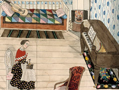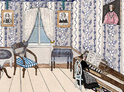 I stort sett sker ändå även i hennes lilla värld en förskjutning från empire-tidens relativt detalj fattiga och enhetliga väggbeklädnader till de rikmönstrade och brokiga tapeterna under Karl XV:s och Oskar II:s tid, och samtidigt märker man att den textila utsmyckningen blir fylligare, bl. a. genom korsstyngsbroderade, svartbottnade mattor under klaveret och framför en byrå. De var säkert produkter av mamsells egen handaflit liksom även de färgglada lapptäcken av kvadratiska eller triangulära bitar, som hon klädde sin långsoffa med och som det alltid beredde henne ett nöje att låta klinga ut i akvarellerna. Mot dem placerar hon gärna sin gitarr som en mjukformad kontrast mot alla de raka eller spetsiga vinklarna eller placerar sig själv - i en blommig klänning och med gitarren i hand - mot det rutiga underlaget. Sådan sitter hon i en interiör från Kocksgatan 5 (1856), sjungande i sin ensamhet bakom en fälld rullgardin med ett romantiskt sydländskt sceneri, medan den trogna kaffepannan värms vid bränderna i den öppna kakelugnen.