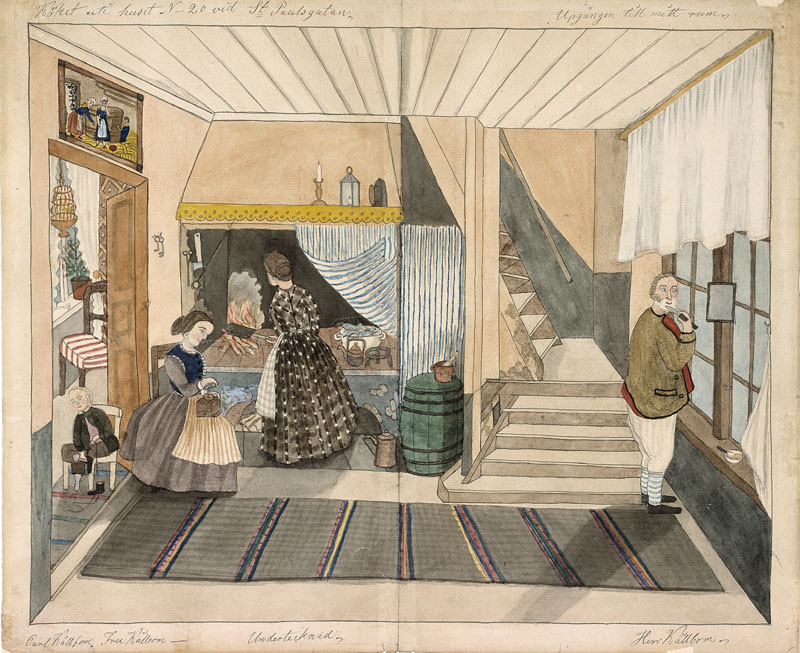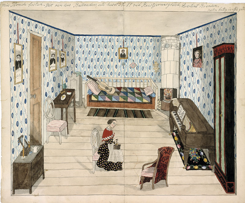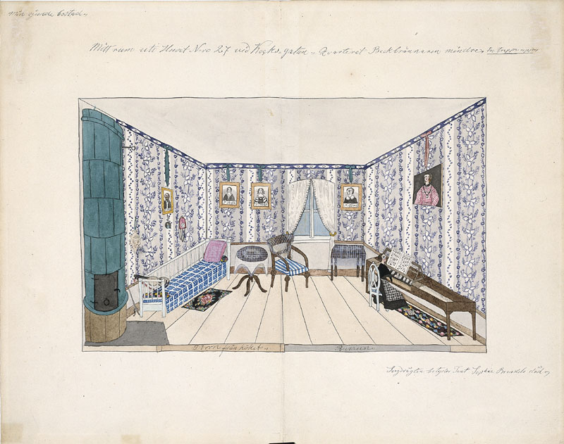 Hennes olika hem - ja minsann, inte mindre än tolv gånger bytte mamsell Sjöberg bostad, men under allt sitt ambulerande förblev hon Södermalm trogen. Under 1838, då hon lämnat sin nygifte bror Nils, bodde hon hos en barndomsväninna, Anna Sofia Appelberg, som gift sig med styckmästaren Anders Rydell och flyttat in i dennes ägande hus Pilgatan 28 (nuv. Folkungagatan). En interiör från familjens vardagsrum förmedlar en stämning av flitig och frodig hushållsidyll.