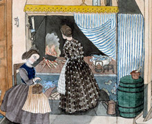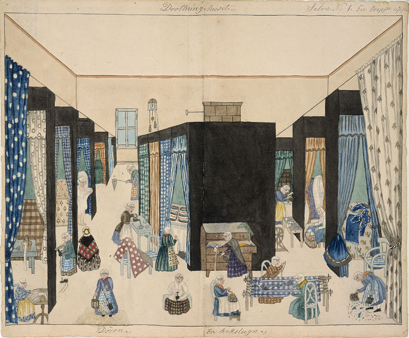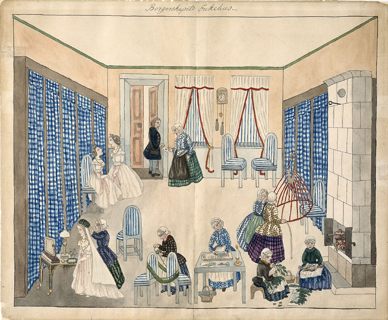 I ett sådant bås logerade under åren 1820-1831 hovinköpareänkan Fredrica Amalia Vibergsson, född 1752, gift med en skaffare vid Adolf Fredriks och Gustaf III:s hov och själv under ett par årtionden städerska hos änkedrottning Sofia Magdalena. Fru Vibergsson var mormor till Josabeth Sjöberg, och det var anledningen till att mamsellen under sina tonår gjorde många visiter i denna gumvärld, som hon långt senare skildrade i ett antal akvareller av spinnande trivsel men också av vederhäftig detaljskärpa i återgivandet av gummornas vardagssysslor och högtidspyssel.