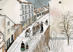 I stark kontrast mot sommaridyllen från S:t Paulsgatan står en utsikt från mamsell Sjöbergs sista bostad här i livet, Blecktornsgränd 6. Från sitt lilla vindsrum däruppe i 6:an har hon sett ut mot väster, mot Tavastgatans mycket oregelbundna fattigbebyggelse med hyreskasernernas ärriga brandgavlar över envåningslängor och plank, uthus och förvildade trädgårdar. Det är en vinterdag med kulen himmel, taken ligger skäckiga av snö och hotar med tunga istappar. Ett par renhållningskarlar sopar och skyfflar snö i en enspänd släde, en kvinna slår upp fönsterluckorna på sin låga kåkfasad, en dam och en liten flicka kommer vandrande i muff och en pojke springer med en korg.