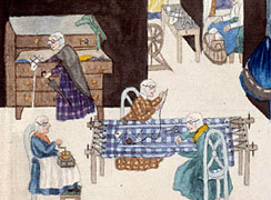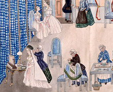 Vardagen glider förbi med alla sina bestyr. En sömmerska skär till en kappa, en väverska mäter upp vitväv med alnmått, någon kardar ull eller vindar eller spinner, någon virkar eller stickar eller syr. En klok gumma sätter blodiglar på en kvinnlig patient - tre på skuldran, tre alltjämt i burken -, medan andra vispar smet till en namnsdagstårta eller lägger en patience eller läser ett dagblad eller dricker kaffe eller låter sig hyllas på en bemärkelsedag med en blomsterbukett eller en målad gratulationstavla. I det senaste fallet ser man mamsell Josabeth och hennes bror Nils vid mammas sida uppvakta mormor Fredrica Amalia, och man har en förnimmelse av att pliktkänslan nog var större än nöjet sådana gånger.