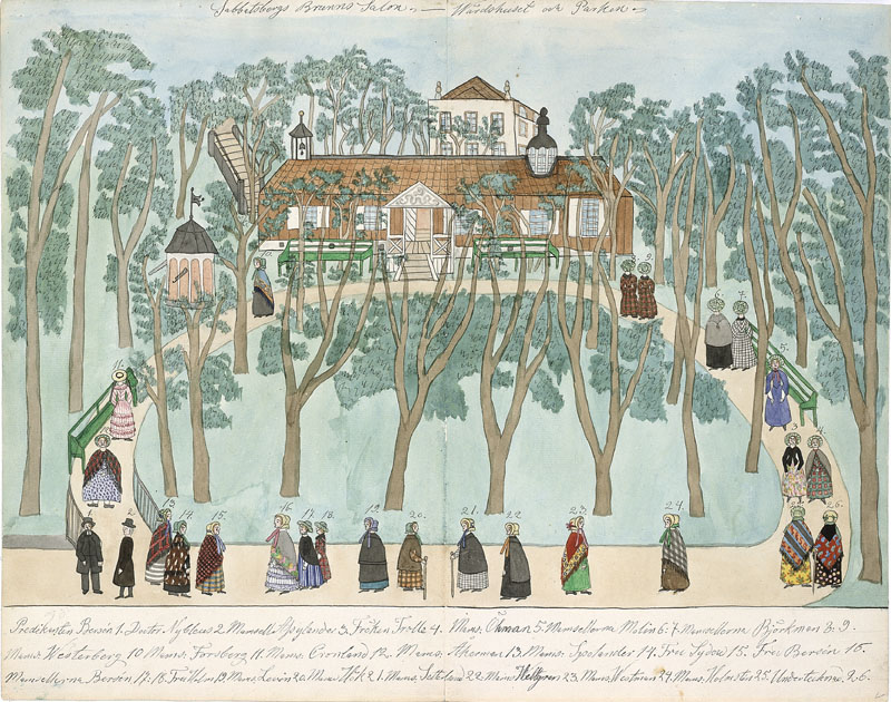 Mamsell Sjöberg måste ha känt sig stimulerad av miljön på Sabbatsberg med dess många människor och den tillfälliga samhörigheten dem emellan. Hon målade en interiör från stora brunnssalongen med vaktmästaren Isberg, som skänker i gästernas glas (själv drack hon 182), samt brunnspredikanten Bersén och brunnsläkaren dr Nyblus i myllret av kvinnliga gäster. Och hon målade brunnsgästernas promenad i den lilla parken nedanför brunnspaviljongen med damer i bahytt och schalett försiktigt stultande i sandgångarna under träden. Det är den klassiska svenska surbrunnsidyllen med ledvärk och magbesvär och beskäftigt skvaller mellan färska bekantskaper, skildrad i en stockholmsk upplaga, som har en stillsam motsvarighet även på våra dagars Sabbatsberg.