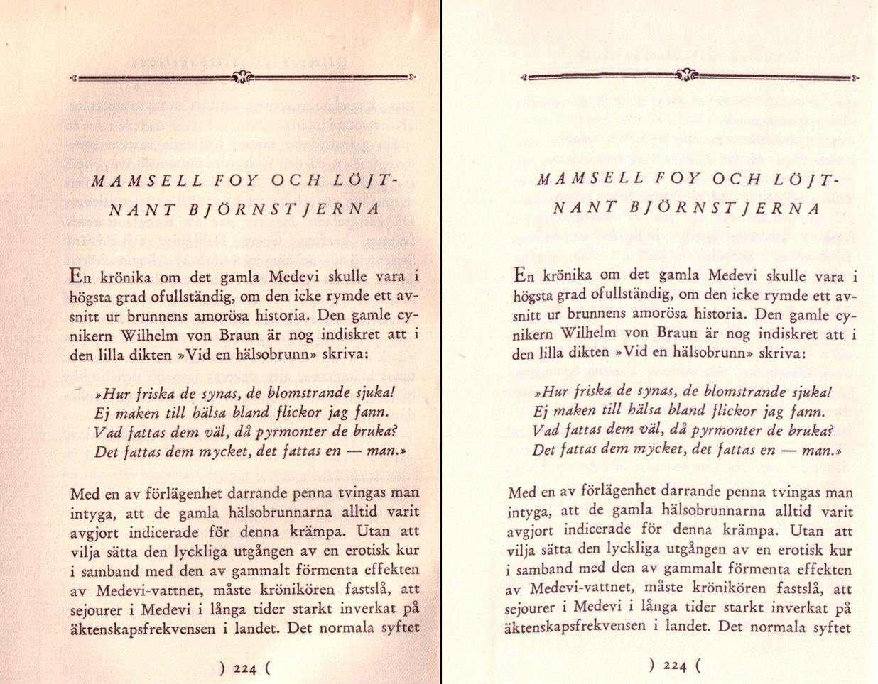 Boken har ett marmorerat omslag som är alldeles jämförbar med originalets, ett väldigt fint papper, och mycket klar och tydlig text och bilderna, fast med en ganska annorlunda färgton, markant svagare i kontrast.
