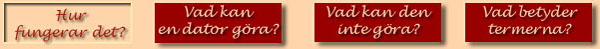 Som bekant, heter dator 'computer' på engelska - en räknemaskin, alltså. Fast den kan bara hantera två siffror, ettan och nollan, på eller av, 'On' eller 'Off'. Men använder man tillräckligt många ettor och nollor, så kan man manipulera hur höga tal som helst: och leker man tillräckligt många sällskapslekar med 'ja-' och 'nej-'svar, så kan man få fram vilken information som helst.